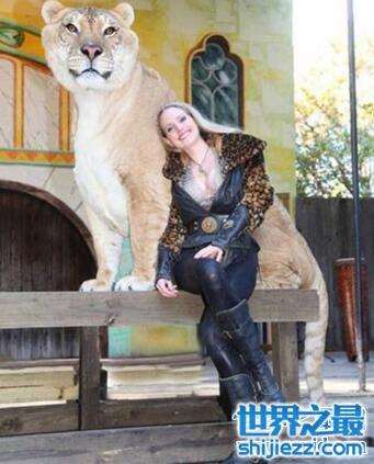 狮虎兽图片中和那位美女的大动物看着像老虎又像狮子,而且体型超大,再有身旁的美女以衬托,就显得差距很大了。其实图片中的动物就是传说中的狮虎兽,是狮子和老虎的后代。这也是属于之前小编给大家盘点十大杂交动物之一。