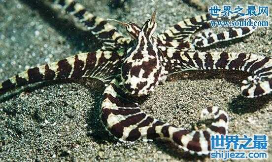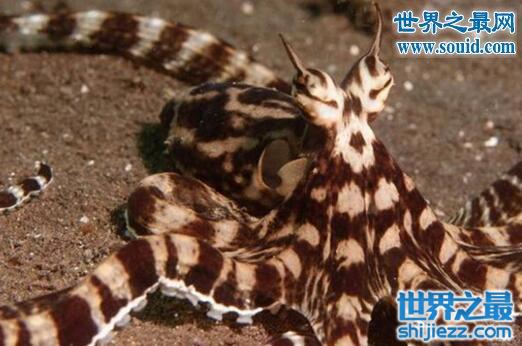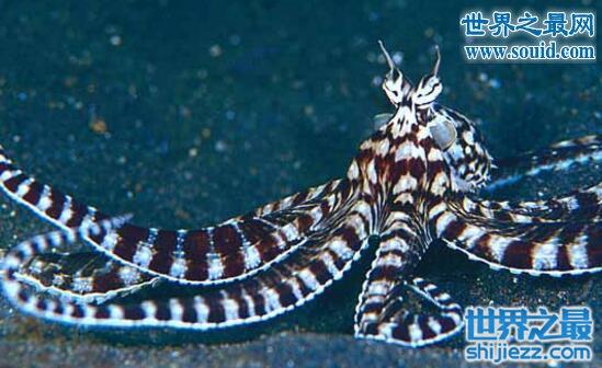 拟态章鱼,自然界中顶级伪装高手。这种身体非常软的动物可以任意改变颜色和形状,拟态章鱼正常体色是带着斑点的褐色,拟态章鱼可模拟多种环境和其他海洋生物,比如:比目鱼和海蛇等。态章鱼的身体有数万个色袋,叫作“色包”,它靠一个复杂的肌肉网络控制。色包含色素,并靠色素来表现多种色度。有时候还能变得像沼泽章鱼一样。