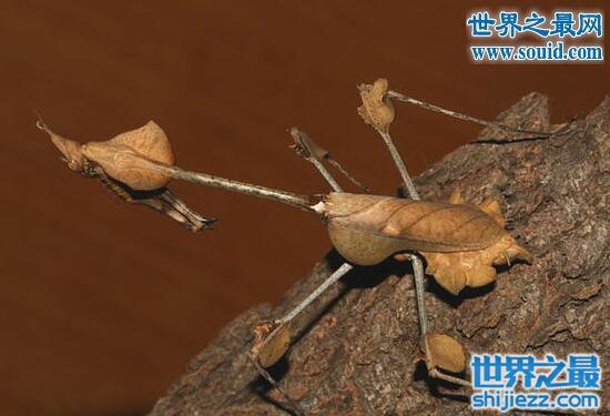 幽灵螳螂长相诡异,而且身体轻飘飘的,像叶子般飘落!很多人第一眼看上去都觉得它们是一片卷皱的枯叶! 原生地在马达加斯加,当地温度和湿度都很高。大多数幽灵螳的体色为枯黄色,枯褐色或是近似焦黑的颜色。
