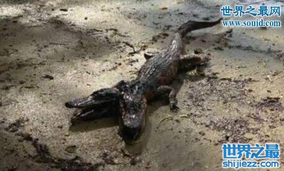 2001年,在泰国曼谷的一个鳄鱼农场里降生了一条连体鳄鱼。两条鳄鱼身体的底部连在一起,已经分不清它究竟是连体鳄鱼还是双头鳄鱼。
