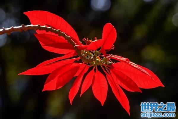 一品红是灌木植物,茎干直立生长,最高能长到4米,卵状椭圆形的叶片呼声,极少数叶片的边缘有波状浅裂,叶片的颜色是朱红色,花果期时间长,能从10月份持续到次年4月。