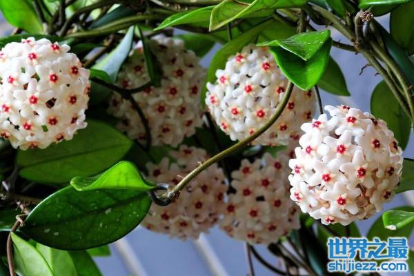 球兰有叫做樱兰,花朵成簇组成球形,有团团圆圆、吉祥富贵的风水寓意,在家中养殖时枝条会下垂生长,可以形成珠帘,观赏性较强。