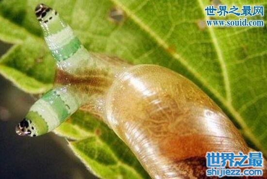 寄生于僵尸蜗牛中的虫子叫做双盘吸虫,他们可以进入蜗牛的消化系统,并长成一条长长的管,其中充满了数百只有生殖能力的尾蚴。接下来,长长的管道入侵蜗牛的触角,形成一种怪异、肿胀、跳动的外观,以此来吸引鸟类的注意。样子也是很可怕了,不过还是比不过异性中恶心的抱脸虫了。