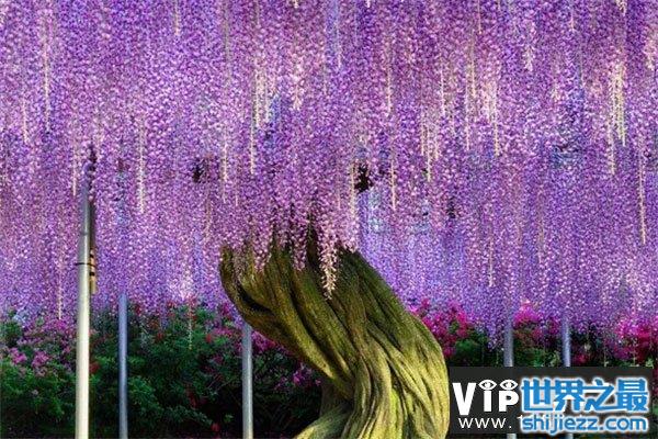 紫藤树位于日本栃木县足利公园,于1870年种植,目前树龄高达150多岁,每年五月是最佳的观赏期,在开花的季节,一袭袭布紫色的花朵都会垂直向下开放,景象壮观,香味浓郁,梦幻得不像真实存在。