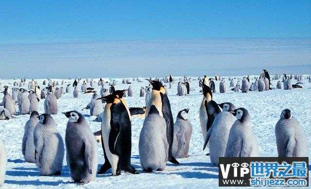 帝企鹅也称皇帝企鹅,是企鹅家族中个体最大的物种,一般身高在90厘米以上,最大可达到120厘米,体重最大可达50公斤,是十大世界上最大的鸟之一。仅分布于南极以及周围岛屿。帝企鹅可以潜入水底150至500米,最深的潜水记录甚至可达565米。主要以甲壳类动物为食,偶尔也捕食小鱼和乌贼。雌企鹅只负责产蛋,由雄企鹅负责孵卵。在孵卵期间,雌企鹅到海里自由觅食。雄企鹅在两个多月内不吃东西,全靠消耗自身脂肪维持体能。当小企鹅陆续地孵化出来后,也是雌帝企鹅返回时,它们将装在嗉囊里的食物带给小企鹅。这时,雄帝企鹅就可以返回海里去捕食和补养身体了。