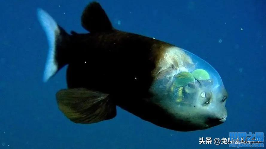 如果你和我一样,也是第一次看到这种鱼,一定会被它奇特的样貌所惊呆。天哪!这条鱼怎么会有一个透明的脑袋啊!像是顶着一个大灯泡一样!它叫后肛鱼,是生活在在深海600米处有一种小鱼,身长只有十几厘米。因为长着透明的头部和管状的眼睛,所以它也叫做管眼鱼。科学家研究认为,后肛鱼管状的眼睛超级敏感,可以在漆黑的深海中寻找食物。而我们所谓的透明脑袋是一个充满液体的透明保护罩,覆盖在眼睛的上方起到了保护眼睛的作用。