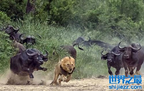 非洲岬水牛有着超级惊人的体重,头上长而尖利的牛角更是可以发挥巨大的作用,在面对危险的时候它们就会用牛角发起攻击。一头牛的话尚且很可怕,但是不幸遇上了种群基本在劫难逃。