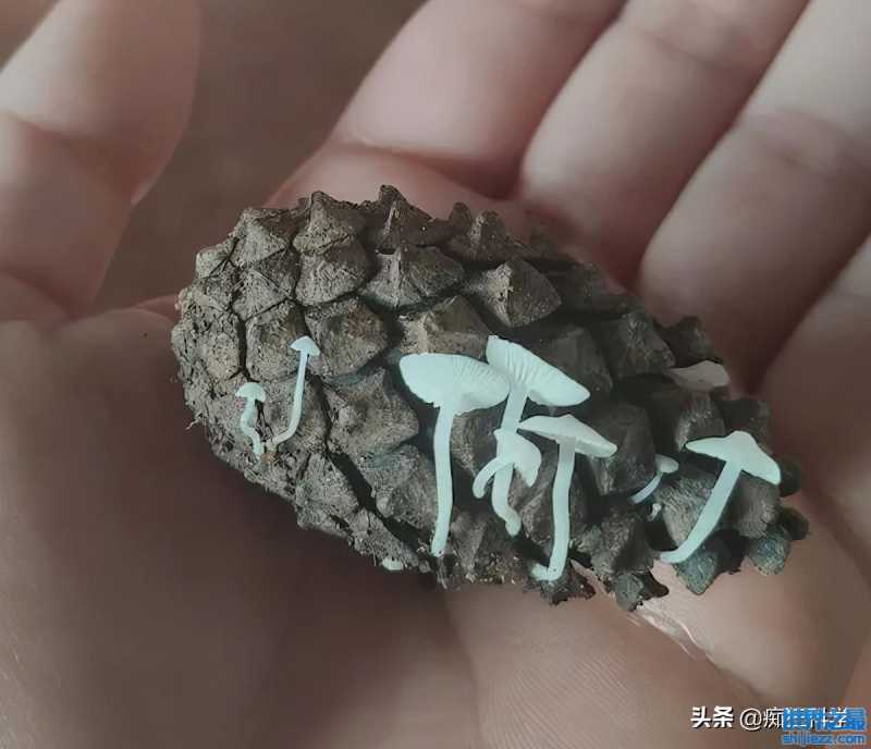 13、落在地上的松果没有发芽却长出了几棵白色的小蘑菇,第一眼以为是松果上写了三个白色的字:小阿丁?
