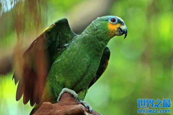 橙翅亚马逊鹦鹉生活在南美洲热带地区,这种鸟的外形比较漂亮尾巴和翅膀上有橙色的羽毛,这种鸟的叫声非常响亮动听。