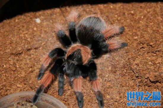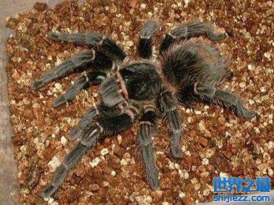 墨西哥红脚蜘蛛,也是一种比较经典的宠物捕鸟蛛种类,通体黑色反射红光,脚是玫瑰红色这是这种无攻击性蜘蛛的明显特征。这是唯一一种群居而不会相食的蜘蛛。它们没有毒液,成年体型在15厘米左右,性格比较温驯,幼体的价格也相对不高。如果想要养宠物蜘蛛的话,这种蜘蛛是一个很好的入门选择。