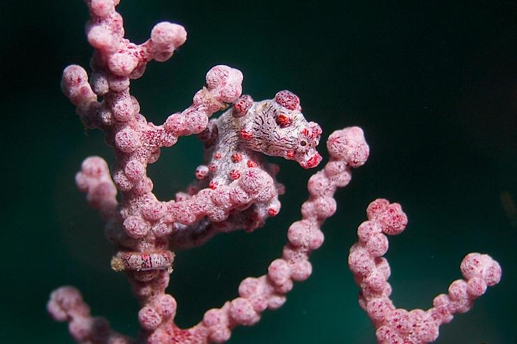 看到它了吗?这是一只巴氏豆丁海马(Hippocampus bargibanti),它尾巴卷在一枝柳珊瑚(也被称为海扇,属于柳珊瑚目的海洋动物)十分完美地与自己所处的环境融为一体。