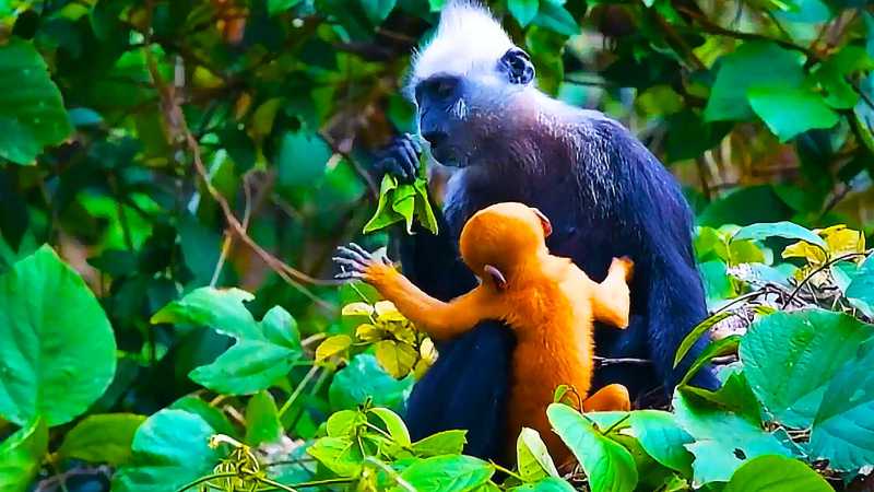 值得一提的是,虽然成年后的白头叶猴为黑色色,但是它们的幼崽却全身金黄,比金丝猴还好看!不过当幼崽达到两岁时,金色的体毛便会逐渐褪去,慢慢变成黑白色,正因如此,它们又被称为“变色猴”。