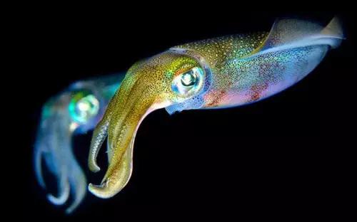 6.这是夜间潜水时拍摄到的一对莱氏拟乌贼。这种大型的枪乌贼在没有月亮的夜晚会游到离水面数米的浅海上嬉戏。