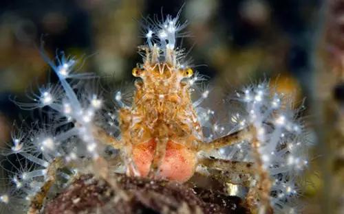 5.这是一只钝额曲毛蟹,又称伪装蟹,也被叫做“装饰蟹”,以善于伪装而得名。在水深10-30米的岩石及水草底,才能捕捉到它的身影哦。