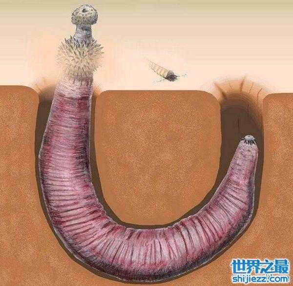 奥托亚虫是一种非常恶心的寒武纪十大恐怖生物,这种生物的长成之后的体长只有2cm-16cm,这种虫子是一种非常厉害的捕手,用一头来诱惑猎物,另一头则是趁机捕杀对方,是寒武纪的海洋中的王者之一。