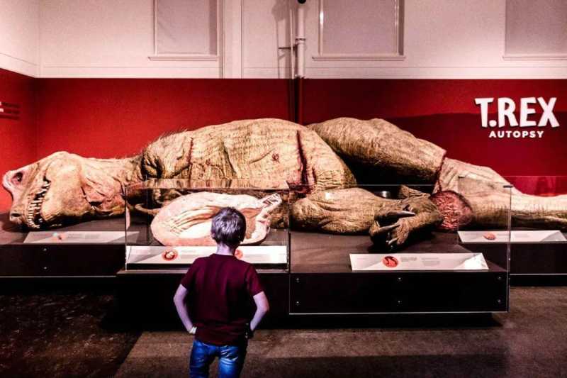 这是一只真正意义上完全仿生制作的霸王龙模型,造价超过600,000美元,是世界上第一只在解剖结构上完整的霸王龙,它是英国为国家地理纪录片霸王龙尸检而制作的。它具有真实可移动的器官,包括微型汽车大小的心脏、柚子大小的眼睛和超过 30 厘米长的牙齿。在被解剖前是有血有肉的,皮肤毛发也真实可见。