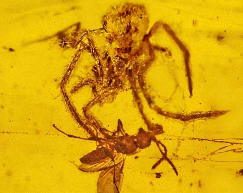 一亿年前,一只蜘蛛正在攻击被困在蜘蛛网里的猎物。突然,一滴树脂从树上滴下来,把它包裹起来,慢慢形成琥珀色。这是迄今为止发现的唯一的蜘蛛攻击猎物的化石。这种蜘蛛生活在9700万至1.1亿年前的早白垩世缅甸胡康河谷。