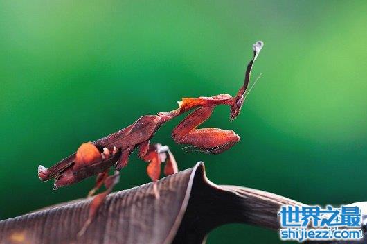 世界上最稀有的螳螂幽灵螳螂,和兰花螳螂一样,不过幽灵螳螂它的拟态更加特殊,它看起来就像枯萎的树叶一样,在一些树林中这是它们很好的伪装,可以让它们捕捉自己的猎物,它最早是来自于马达加斯加的一种螳螂。