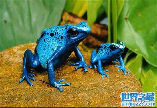 箭毒蛙的身体比较小,只有5厘米,浑身都散发着蓝色的光彩,十分的艳丽。别看他们是小小的蛙,但是却有着非常毒的毒性,一滴毒液足以至十个成年男性死亡。