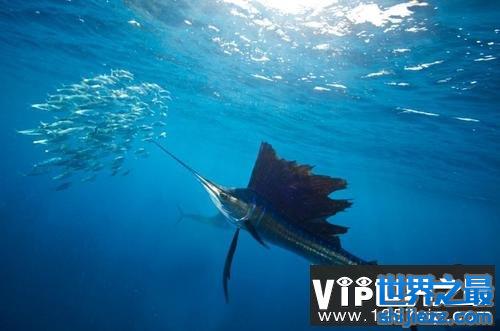 下面要说的旗鱼,他的背鳍像一面竖起来的棋子,士一样,所以叫做旗鱼,和剑鱼一样,也拥有着较为长的长矛,长在前端可以减少水的阻力,而他在猛冲的时候,他也会放下他的背鳍,这样可以大大的加快速度,它捕食时速度可以达到110千米每小时,是速度最快的十种海洋动物之一。