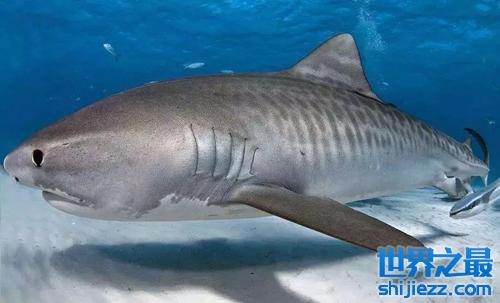 虎鲨,它和普通的鲨鱼其实并不一样,因为它的体型要大很多,而且它是十分凶猛的一种鲨鱼,它在各地记载均有袭人的事件,而且他的游泳速度是非常快的,可以达到将近70公里每小时,这超过了大部分海底生物的游泳速度,所以他在海里也是一个顶级的捕食者