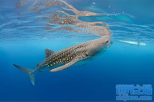 鲸鲨相比于虎鲨来说要温柔很多,但它比虎鲨要大很多,体长可以达到20米,主要以海洋表面的浮游生物和小型鱼类为食物,他的体重可以达到1万公斤以上,可以说是海洋上的浮岛,但你没想到的是这样一个庞然大物,竟然有一个非常快的移动速度,可以达到18米每秒,是速度最快的十种海洋动物之一。