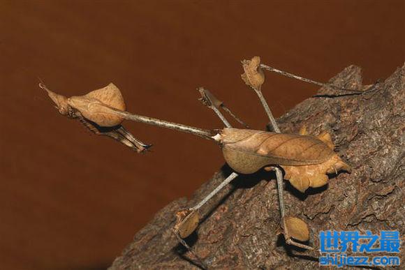 枯叶螳螂,来自马来西亚,外形酷似一片枯叶。体色棕色,有模仿枯叶的深色和浅色斑点。它的胸部恰似半片枯叶,一对翅膀收拢后,看上去就更像一片完整的枯叶。