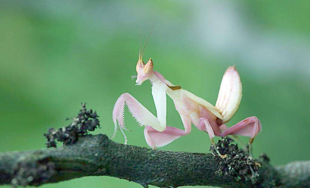 这种看上去像植物的生物奇妙之极,学名叫Hymenopuscoronatus,通常被称为兰花螳螂。在南亚的热带雨林,这种昆虫进化出了独特的伪装本领,可以与一些独特品种的粉红色兰花完美地融为一体,令人真假难分。当它们的四条腿站立起来的时候,看上去就像兰花的花瓣,为它们潜伏在花丛中,等待时机袭击果蝇提供了完美的掩护。
