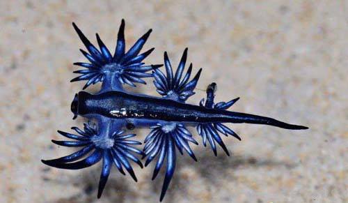 这是一种海蛞蝓,一种极其微小的海洋腹足类软体动物,身长通常不到2.5厘米,淡淡的银蓝色的身体上布满了深蓝色的条纹。这种海蛞蝓以捕食一些比自身还大的海洋生物,如僧帽水母为生。在海洋的表面张力下,它们将身体倒悬漂动,侍机向猎物发起攻击,将浓浓的毒液注入猎物的身体。