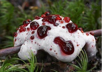 当你徒步穿越树林遇到这种看上去鲜血淋淋的植物时,你也许会怀疑自己在无意中发现了一个可怕的犯罪现场。这种植物通常生长在针叶林的底部,学名叫作Hydenellum peckii,不过它们还有个非常贴切的通俗名称:血牙真菌。这种植物生长在美洲、欧洲、伊朗和韩国等地。血牙真菌在幼小时,会流出一种如鲜血般红艳的汁液,汁液中含有一种具有抗凝特性的红色色素,但这种奇特现象并不会持续很久,成熟以后的血牙真菌看上去与普通的棕色蘑菇没什么区别。