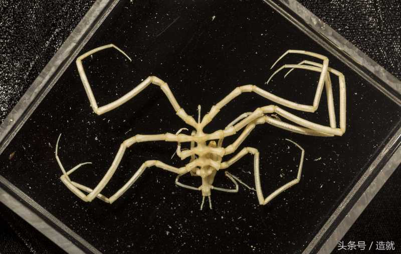 这是一只海蜘蛛。拜托,它就是一堆拼接起来的管子,对吧?没错。海蜘蛛通过它们的壳状体表进行呼吸,但其呼吸只是被动交换气体。它们在各个细胞内消化食物,没有专门的消化器官。它们通过腿部的运动来促使血液循环,而腿部的运动是利用单细胞肌肉完成的。海蜘蛛几乎不算是动物,它们的生命形态实在太原始了,但我们还是把它们算作动物,因为它们已经存在了4.25亿年,是现存最古老的节肢动物之一。