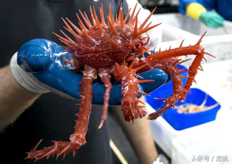 为免过于专注鱼类,我们再介绍一种看起来吓人的甲壳类动物。这种岩蟹及其十足甲壳类同胞未必生活在深海区。一些在较浅的海域被捕获,但很多都是深海动物。它们生活在很深的海域,而且离大陆架非常远,所以看起来不像生鲜超市里的那些螃蟹。