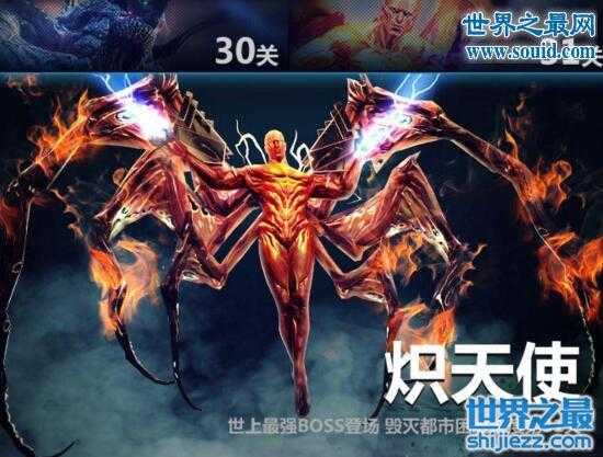 它是封印在上古巨蜥的体内的终极兵器,利用上古巨蜥强悍的身体来当做封印的容器。当玩家在“毁灭都市”中击败30关的上古巨蜥后,在31关即会出现一只暴走的上古巨蜥,在打败暴走的上古巨蜥后,“炽天使”将作为终极BOSS出现在玩家面前。玩家需要在有限的时间内打败“炽天使”方能通关。