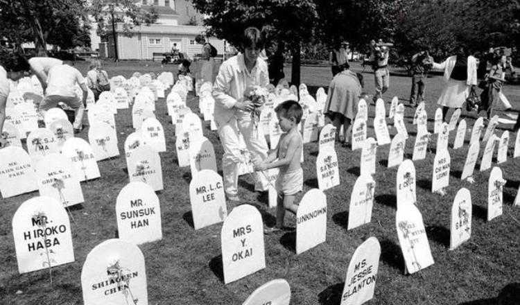 1984年8月31日,大韩航空客机遇袭一周年,在华盛顿拉斐特广场,人们摆上纸制的墓碑,祭奠遇难者。在客机被击落的13年来,围绕这些问题,各种说法扑朔迷离。