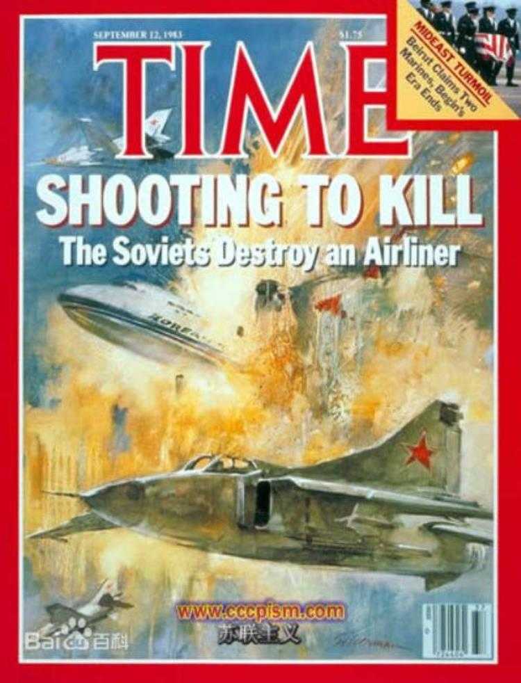 (《时代》周刊关于此事件的封面,可以看到《时代》并不知道击落韩航007的机型是什么,因为画中的军机均为米格-23。)