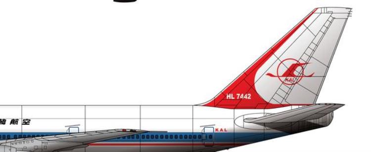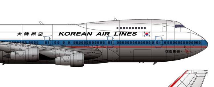(以上为本厂长绘制的大韩航空007航班波音747客机HL7442号左舷前部细节,机腹为灰色,机身为白色,腰际线为上一道宽蓝带和下一道窄红带,机头驾驶室下方有小型得大韩航空标志和韩文“大韩航空”字样,第一对出入舱门后的机体上依次绘有韩国国旗、大韩航空英文字样以及“大韩航空”汉字字样,整个垂尾前三分之一的位置被刷成红色,随后是大韩航空标志,白色的HL7442机号印在垂尾红色的区域以示醒目)