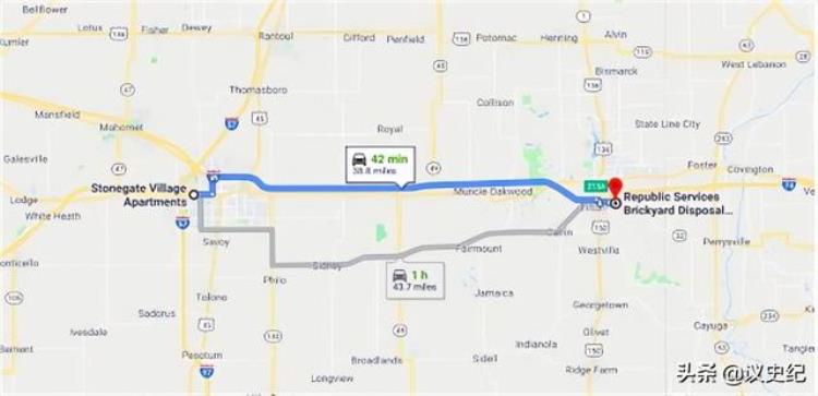 从凶手家到该填埋场之一的路径,驾车约42分钟