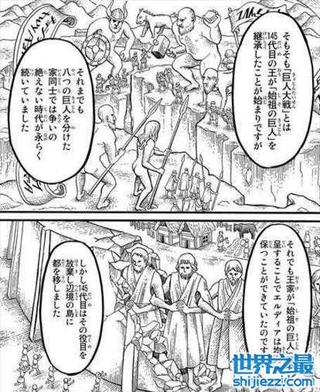 最终形成了马莱国和艾尔迪亚国两大对峙的势力,相互平衡的情况下,又在进行着无止境的巨人战争,直到艾尔迪亚的王室的145代国王,他想要结束这个战争,于是便带领着他的国民,迁都到「パラテイア島」,也就是整个故事开始的小岛。