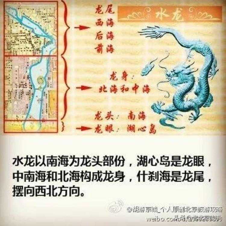 水龙比较明显,南海是龙头,湖心岛是龙眼,中南海和北海构成龙身,什刹海是龙尾,摆向西北方向。