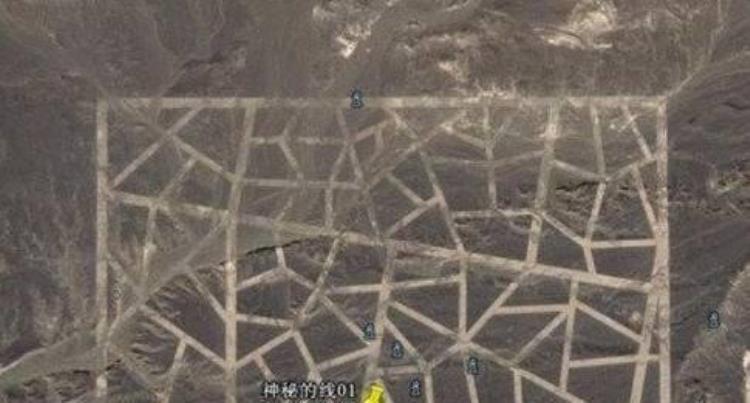 中国沙漠中的这些马赛克线条是谷歌地图最先发现的,但其目的仍然是一个谜。据一些报道称,这些线条建于2004年,作为一个军事目标演习基地,但这样的目的说法尚未得到正式确认。有些人认为这些线条是一种符号或图像,为了让不明飞行物从太空轨道上就能看到,类似于关于秘鲁阿塔卡马沙漠纳斯卡线条的说法。