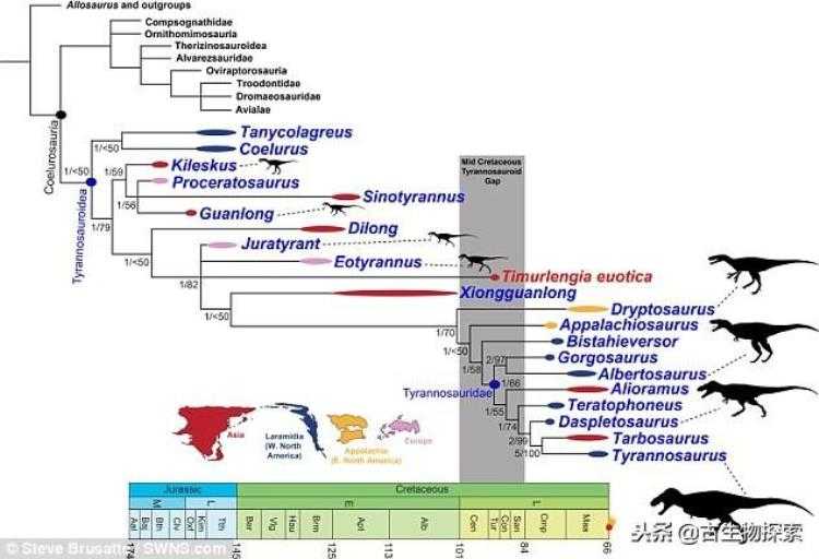 图注:帖木儿龙在暴龙进化树中的位置,图片来自论文,由江氏小盗龙翻译整理