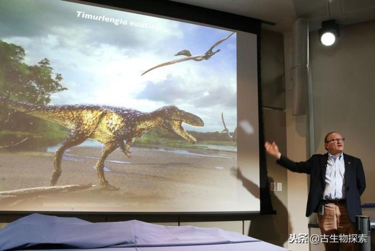 图注:布鲁萨特正在发布会上展示帖木儿龙的复原图,图片来自网络