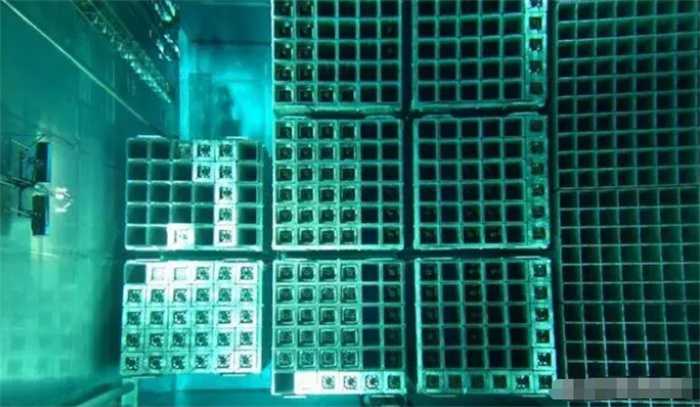 在这个水池中,大部分都是水,和普通水池唯一的不同就是,在核废料池的底部,会有一个存放着核废料的大罐子,这里有很多核燃料棒。