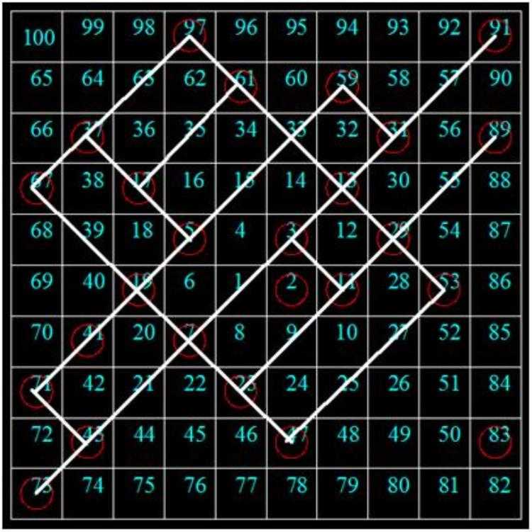 1963年的一天,美国数学家乌拉姆在参加一个学术会议时,为了打磨时间,他就在一张纸上画出方格,把自然数1放在中心,将2,3,4……这些自然数按逆时针方向螺旋一层一层分布在1的周围,而后他又将质数圈了出来,结果使他非常惊奇,原来,这些质数有秩序的集中在一些斜线上。如下图.