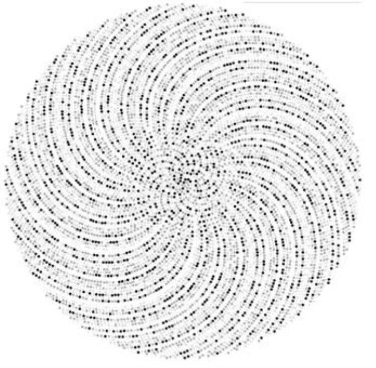 这个图仅仅是前100个数,而如果放到40000的图中,如下图,黑点为质数,惊奇发现质数呈现螺旋分布.