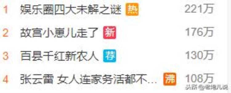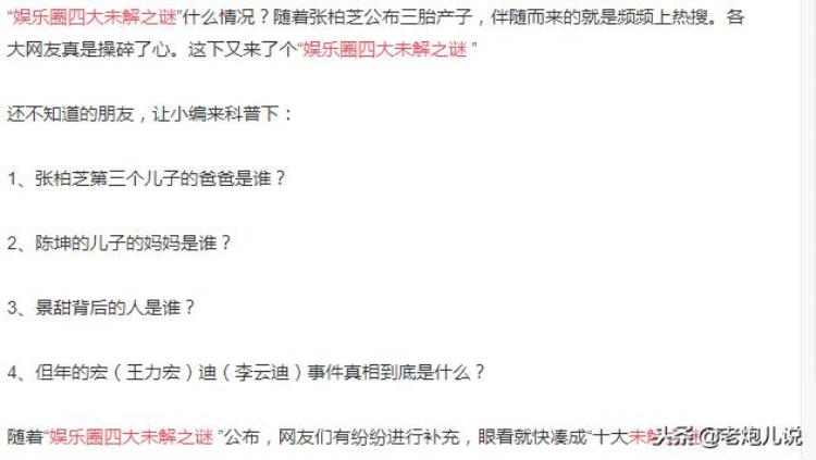 网友列举,娱乐圈“四大未解之谜”。而网友们对这位充满争议性女神的第三个孩子的生父,实在太过好奇。从张柏芝发文确认承认的半天里,一场猜测发酵无果后,网友把这个谜团并入了娱乐圈“四大未解之谜”,而这个话题仅仅两小时就登上了微博的话题榜单。虽然很多网友自创了许多谜团,但经过了解比较,除了新上榜的张柏芝第三个孩子的生父外,大部分关注的还是一直围绕在几个问题上。