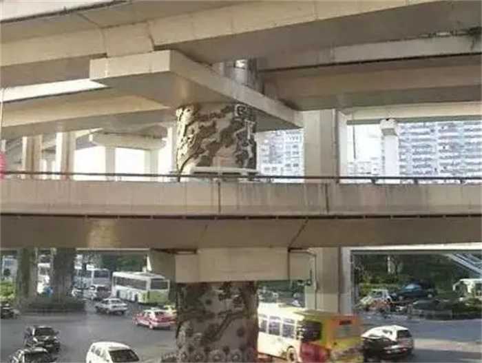 至于柱子上装饰,是因为那根柱子贯穿支撑了好几层桥面,如果不加装饰,就会与桥体一样是水泥色,会容易出现一种错觉,会有压迫感,影响过往的司机做出一些多余动作,有可能影响交通安全。