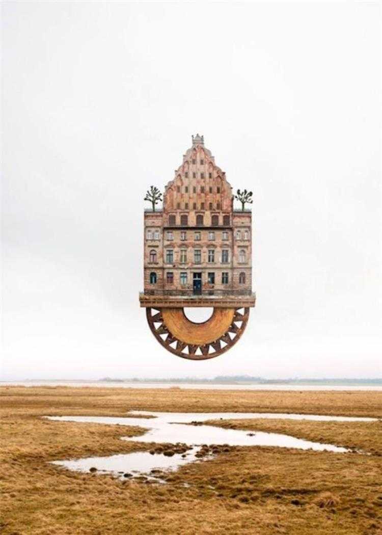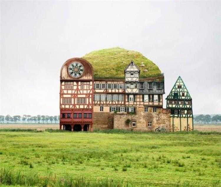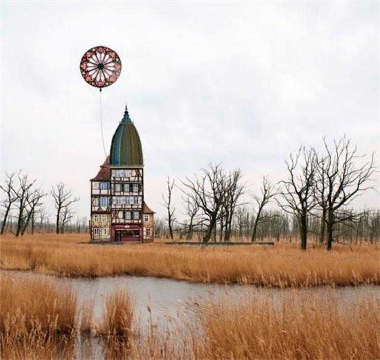 Matthias Jung形容自己的作品是复合形态的诗,不以文字为媒介而是图像与建筑。仔细看他的作品时,可以发现这一幢幢诡谲却梦幻的建筑其实是不同建筑、地方的拼贴,例如欧洲乡下某处的英式老房子却在屋顶上加了牧羊的草原;看来像是布拉格街上的房子腾空飞起,底座连着的是却是乡村的磨坊。