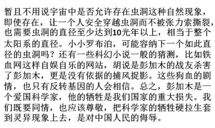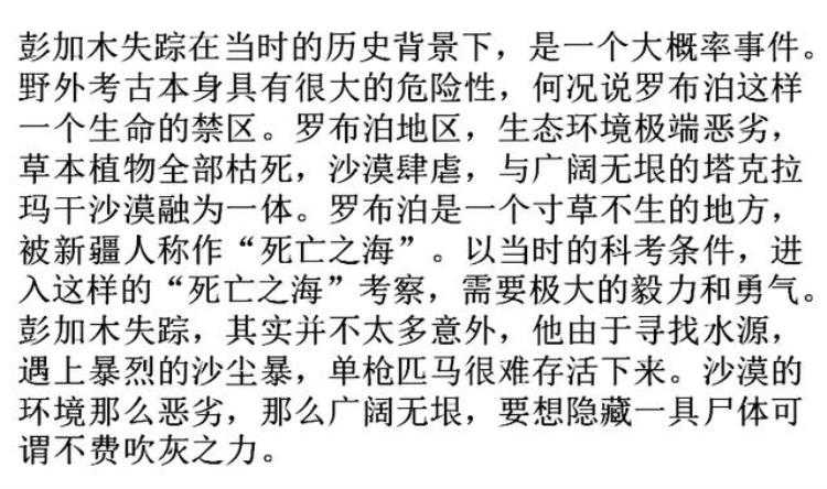 说法太多就不一一列举了,总之越说越玄乎,越说越离奇,彭加木的尸骨现在都没有找到,也许不久的将来 历史 总会给出一个答案,也给彭加木的家人一个安慰。