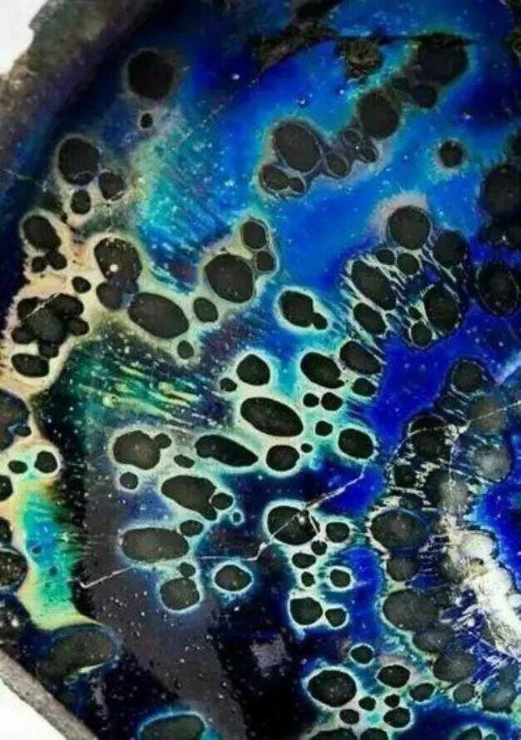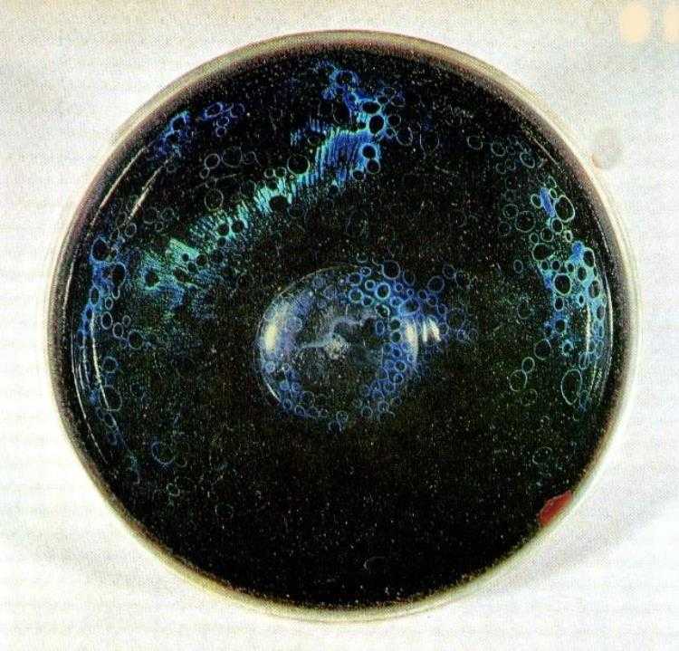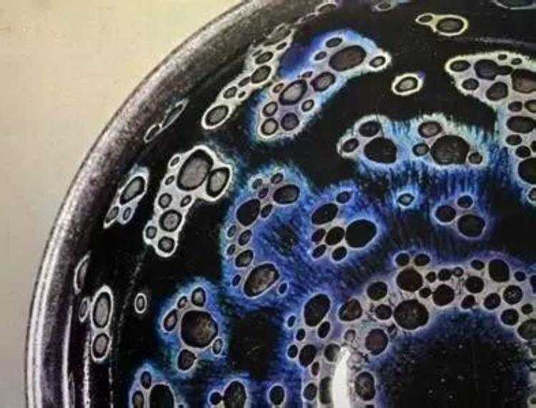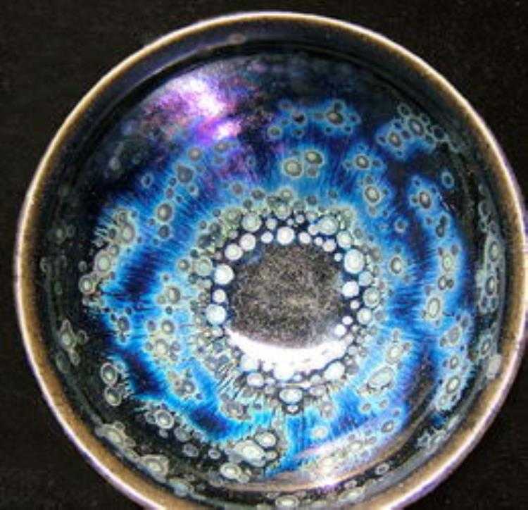 在天建盏瓷器家族里,有一个特殊成员:曜变天目。其特点是: